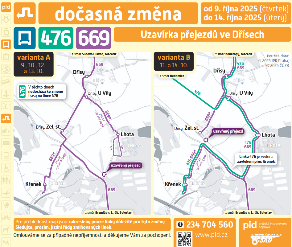 Z důvodu uzavírek železničních přejezdů pojede linka 669 odklonem dle následujících schémat.