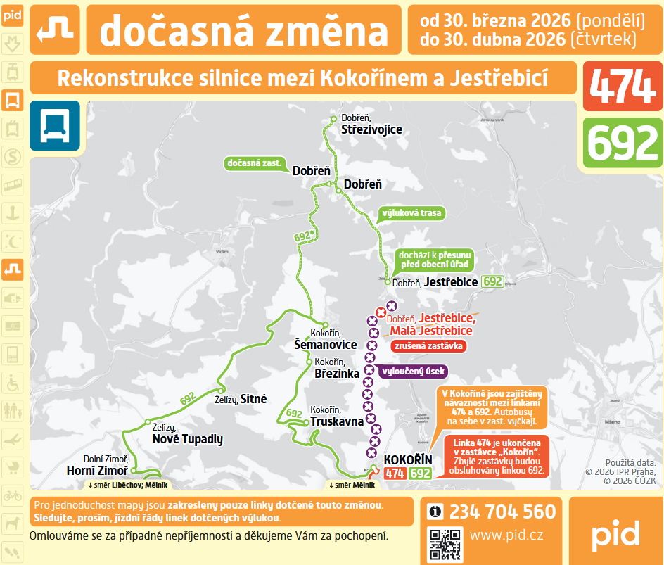 Z důvodu uzavírky silnice Tuklaty – Tlustovousy pojedou linky 484 a 677 v čase 7:40 – 23:59 mimo zastávku Tuklaty, Hlavní (zrušena bez náhrady). Ranním spojům do 7:40 bude umožněn průjezd uzavřeným úsekem.