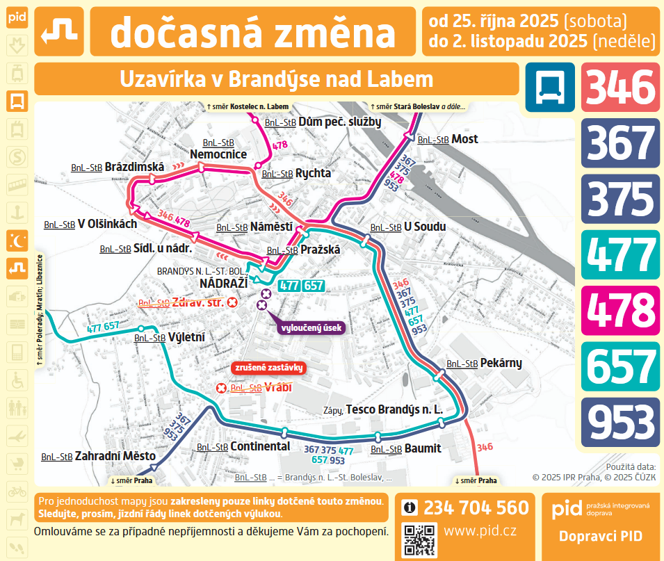 V termínu od 27.10. do 2.11.2025 dále dochází z důvodu uzavírky ulice Tyršova k odklonu mimo zastávky Mělník, Pivovar; Mělník, Podolí; Mělník, Zádušní a Mělník, Tyršova (všechny zrušeny bez náhrady)